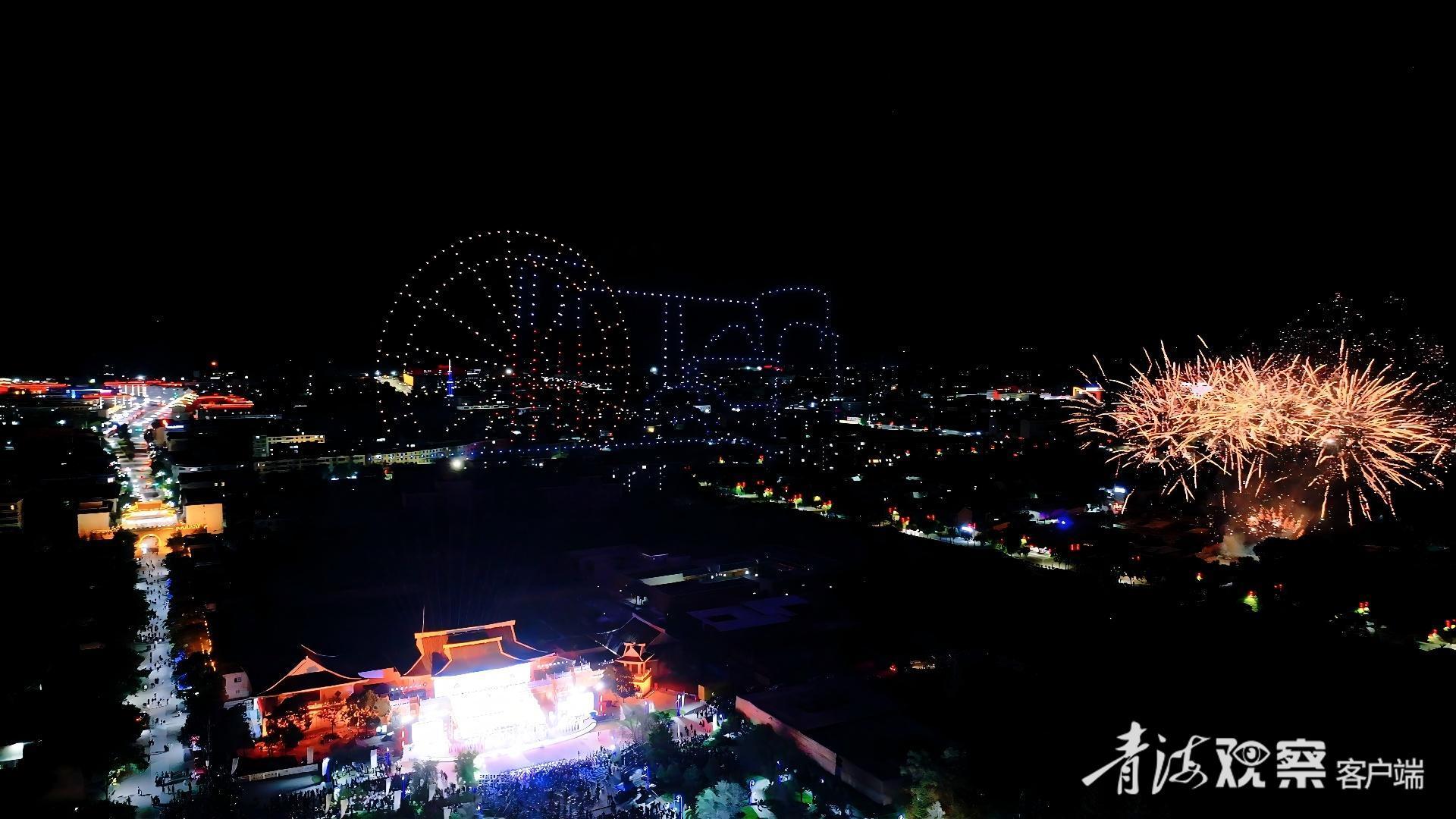 文艺晚会、无人机灯光表演和烟花秀等精彩节目轮番上演,欢庆双节。贵德县委宣传部供图