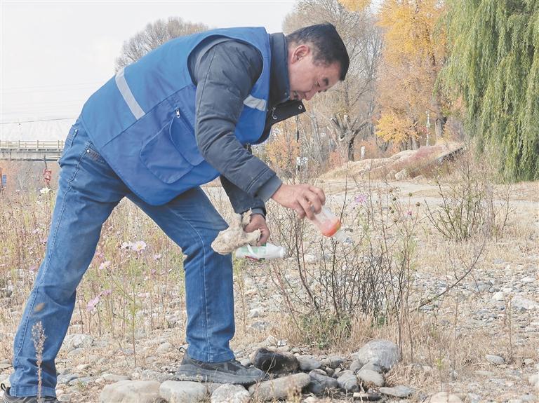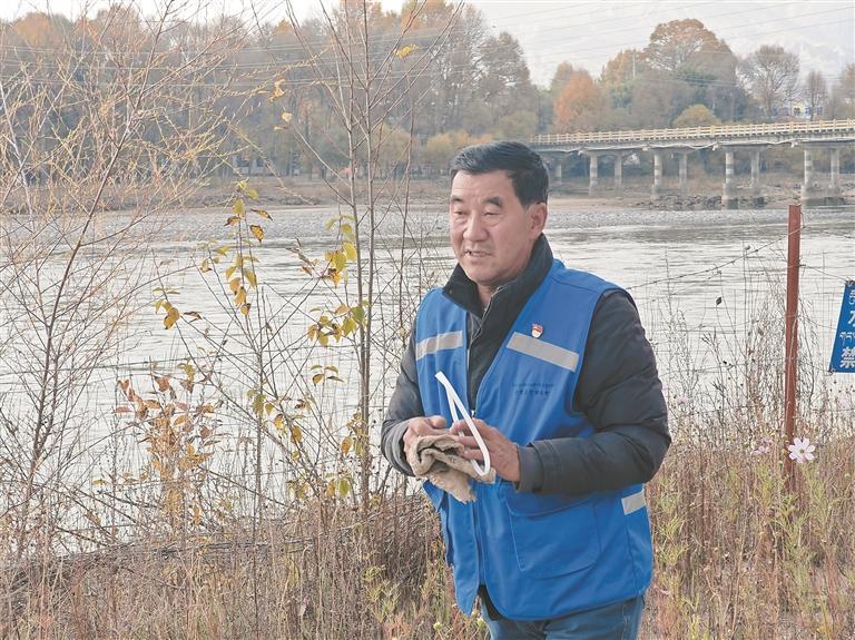 午后的贵德,黄河水在高原阳光下流淌,像是撒了一河碎金。62岁的王延忠将长柄夹掖在腋下,沿着河岸慢慢地走。左腿不便,身子随着脚步轻轻摇晃,像岸边那棵在风里站了百年的老旱柳。可就是这看似蹒跚的脚步,九年来在黄河岸边走出了三万公里。
