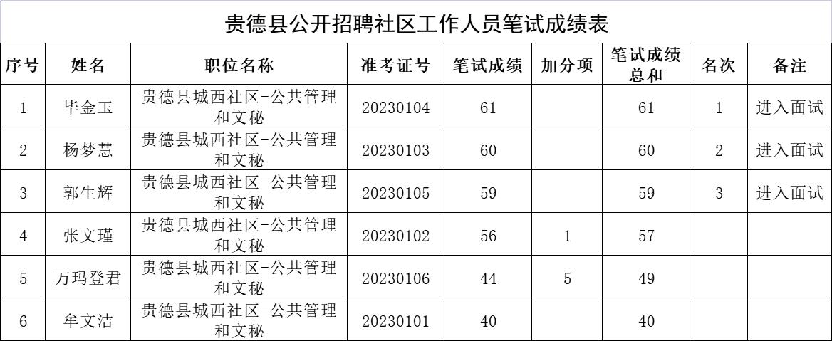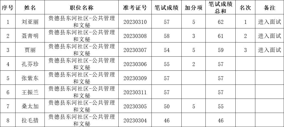 索引号: 发布机构: 生效日期: 2023-02-11 废止日期: 文 号: 所属主题: 招考录用 贵德县公开招聘社区工作人员笔试成绩公示 来源: 发布时间:2023-02-11 浏览次数: 次 【字体:小 大】 现将贵德县公开招聘社区工作人员笔试成绩予以公示,公示时间为2023年2月11日-2023年2月17日,请广大干部群众监督,面试时间另行通知。 监督电话:0974-8553268(县纪委监委) 附件:贵德县公开招聘社区工作人员笔试成绩表 贵德县公开招聘社区工作人员领导小组办公室(代) 2023年2月11日 【打印正文】 分享到: 【字体:小 大】